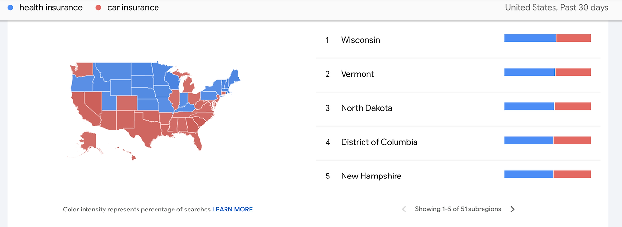MAP: search interest in health insurance evenly split with searches for car insurance across the US in the past month