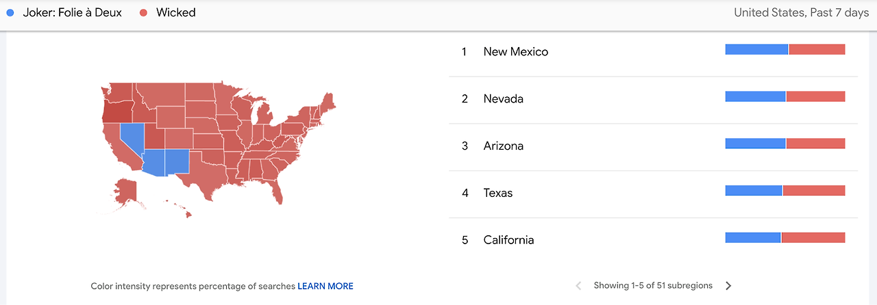 MAP: search interest in Wicked is higher than Joker: Folie à Deux, in every state but three