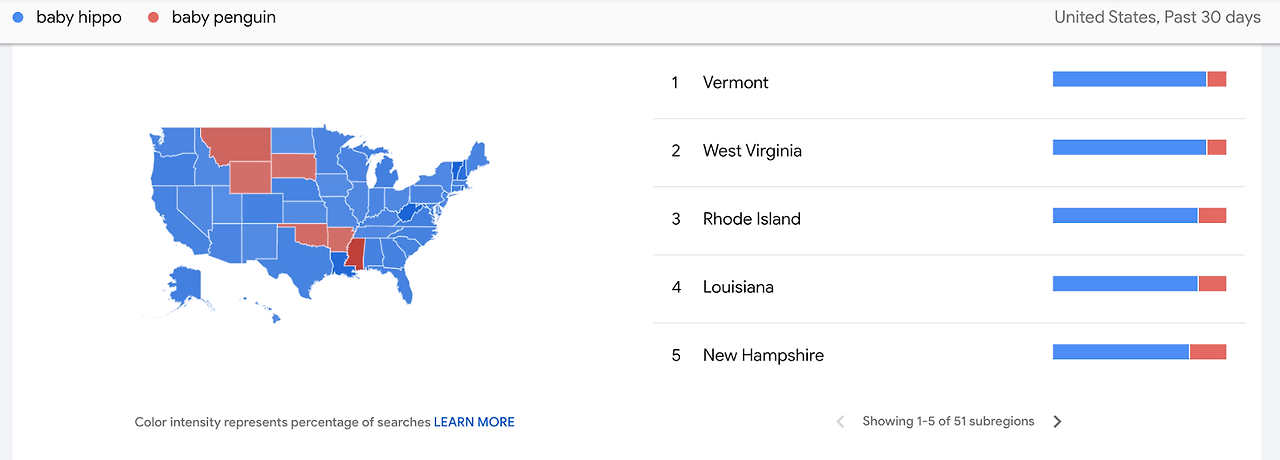 - Baby Hippo is searched more than Baby Penguin in all but six US states over the past month