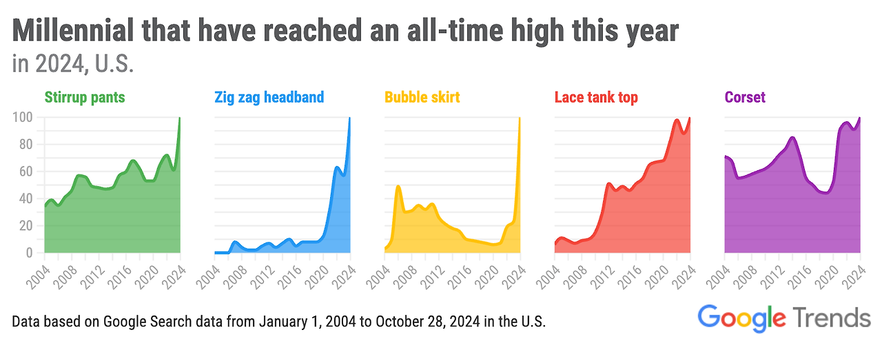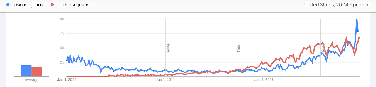 GRAPH: “high rise jeans” surpassed “low rise jeans” in 2016 but as of June 2024, “low rise jeans” are now more searched