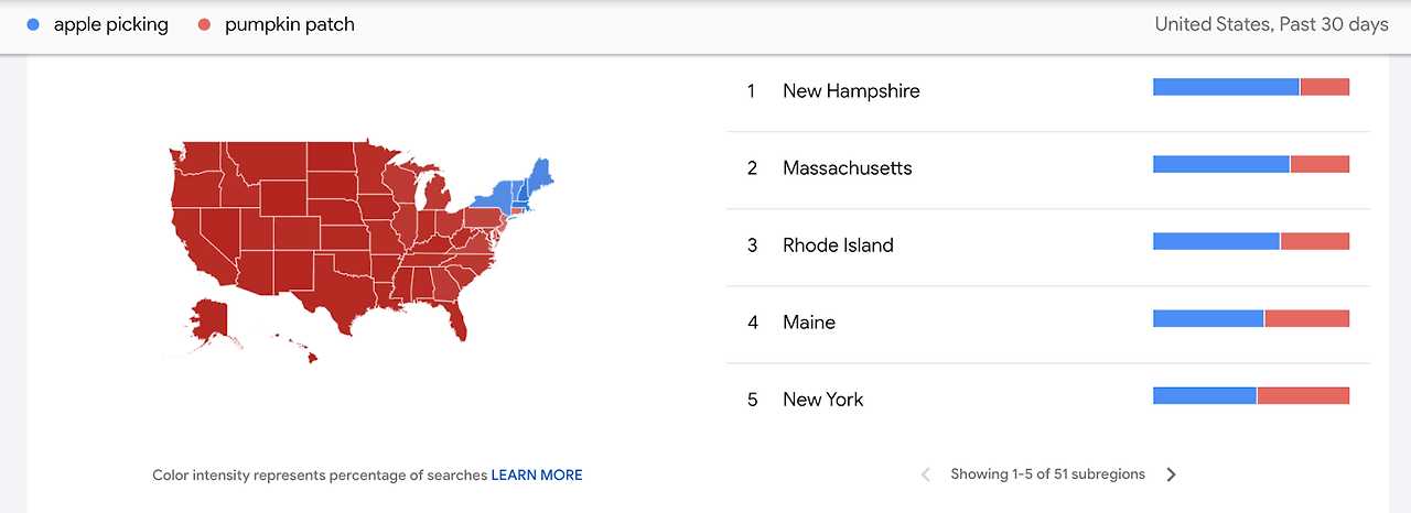 MAP: “pumpkin patch” vs. “apple picking” searches across the US- apple picking stays the favorite in the northeast while the rest of the US searches for pumpkins
