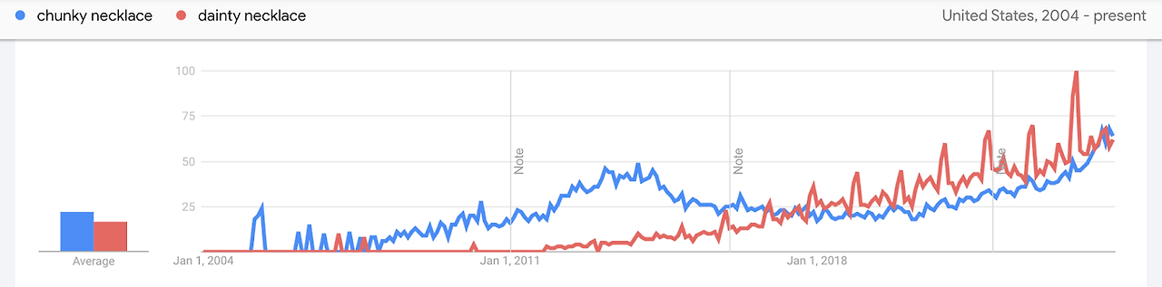 GRAPH: Search interest in “dainty necklace” surpassed “chunky necklace” in December 2016 but as of September 2024, “chunky necklace” is searched more