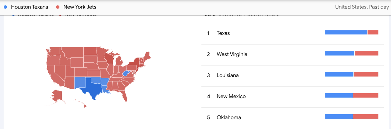 - MAP: All but 5 states were searching for the New York Jets more than the Houston Texans ahead of their Thursday Night Football matchup