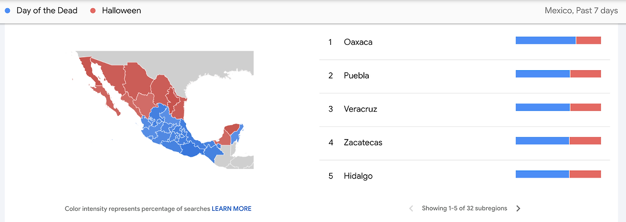 MAP: In Mexico, the Northern regions searched more for Halloween this week, while the Southern regions searched more for Dia De Los Muertos