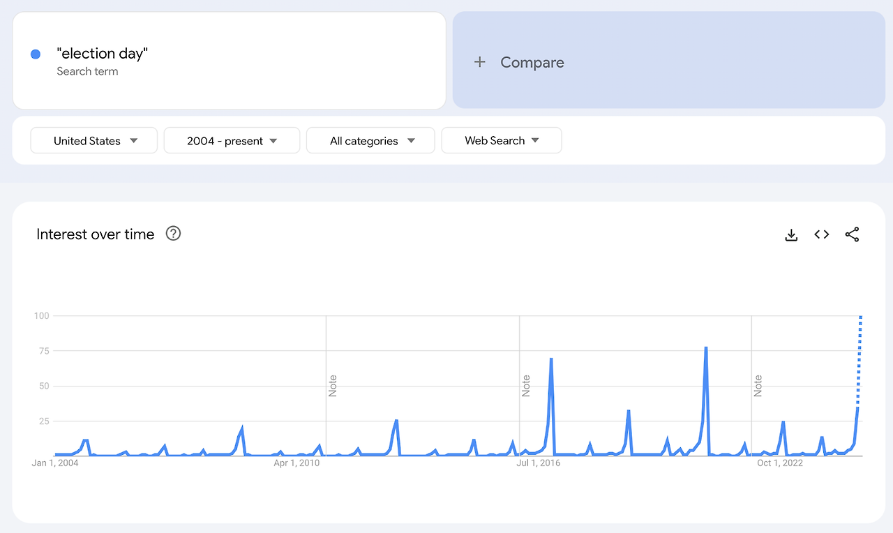 - “Election day” is searched now more than twice as much as any other election day in Google Trends history
