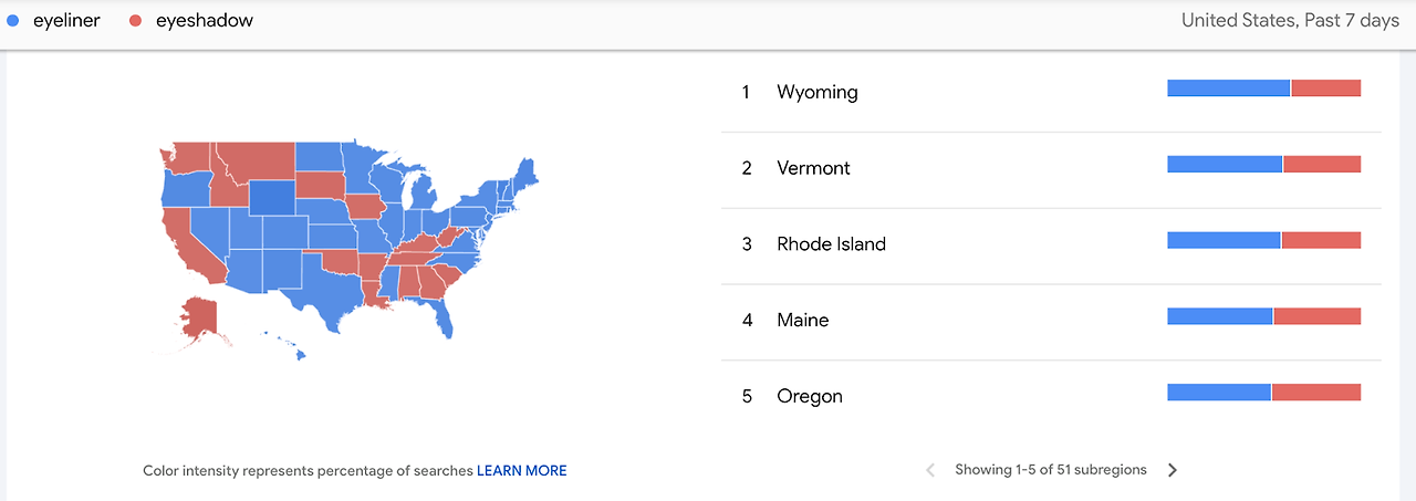 - MAP: Search interest in eyeliner and eyeshadow was even across the US in the past week