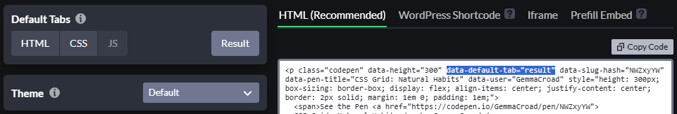 나타나는 임베드 코드에서 data-default-tab="result,babel" 부분을 data-default-tab="result"로 수정합니다.